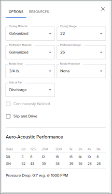2. Aero-Acoustic Performance. Displays octave band Dynamic Insertion Loss, Generated Noise, and Pressure Drop at the specified airflow.